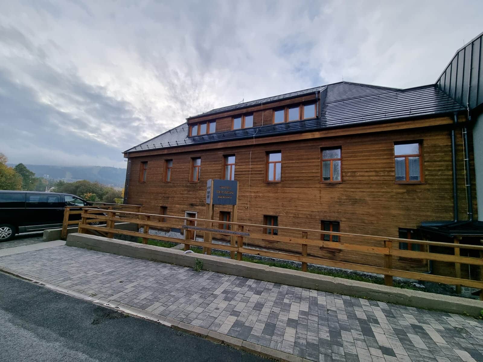 Apartmán se nachází v přízemí budovy vlevo vedle hotelu.